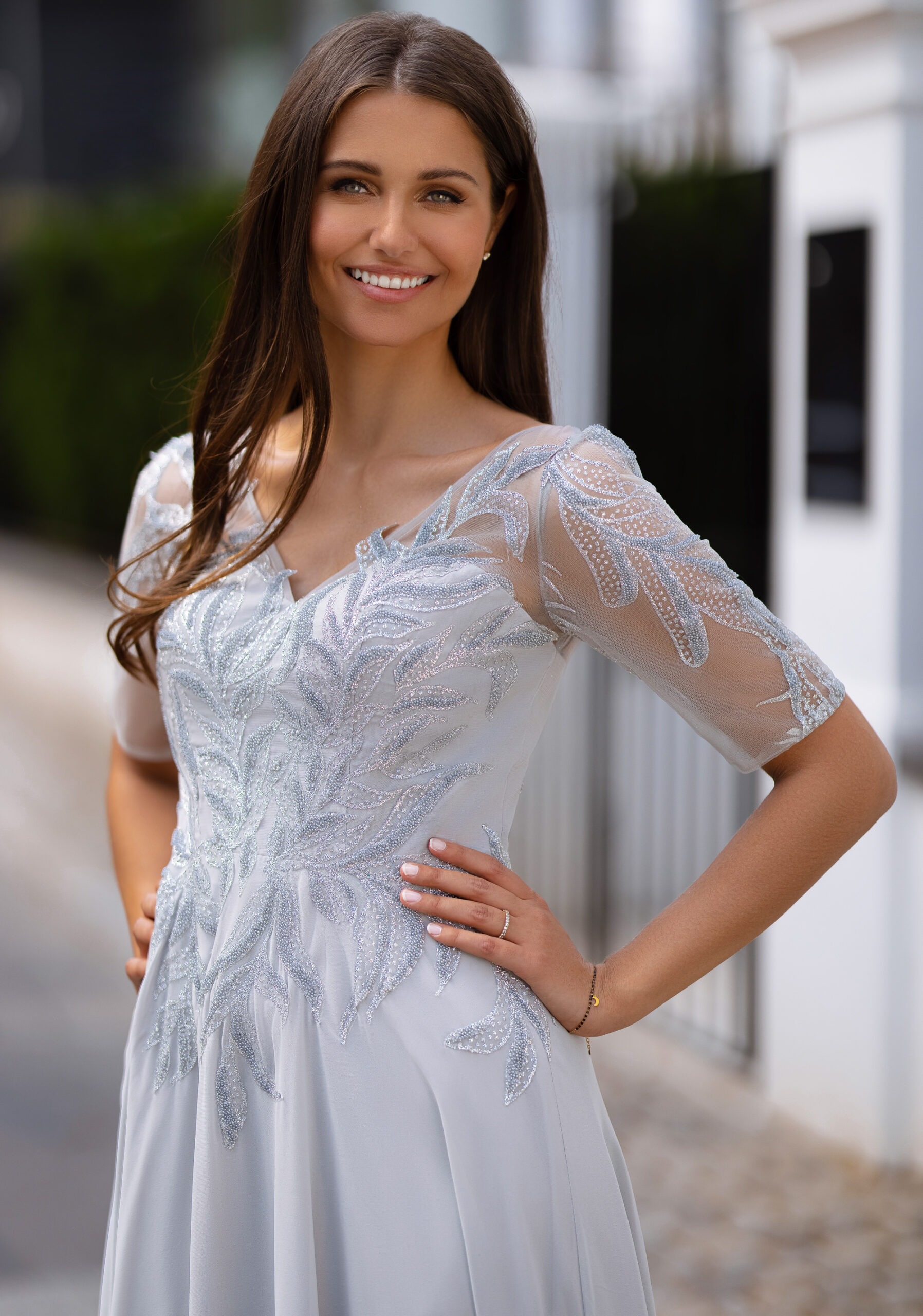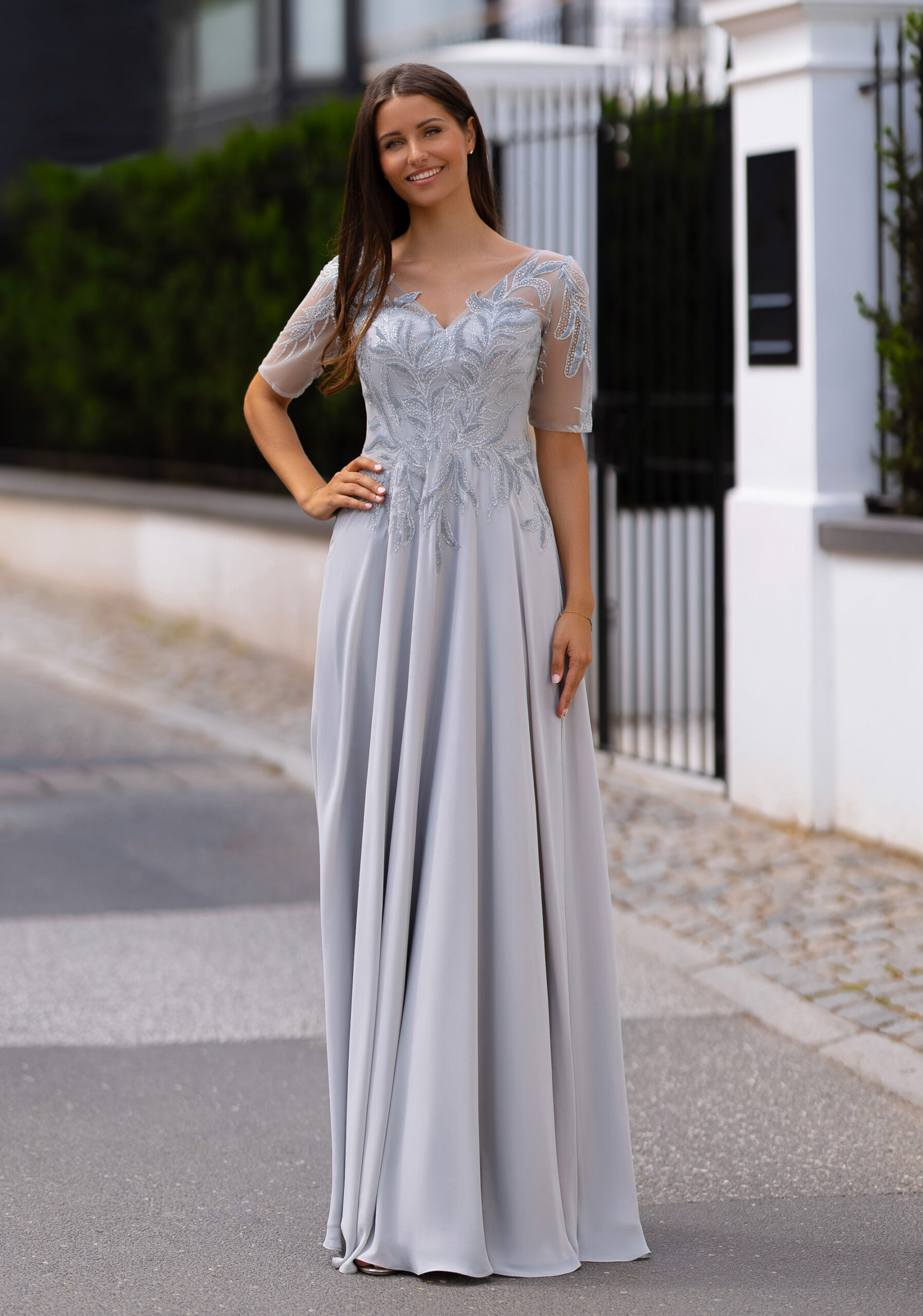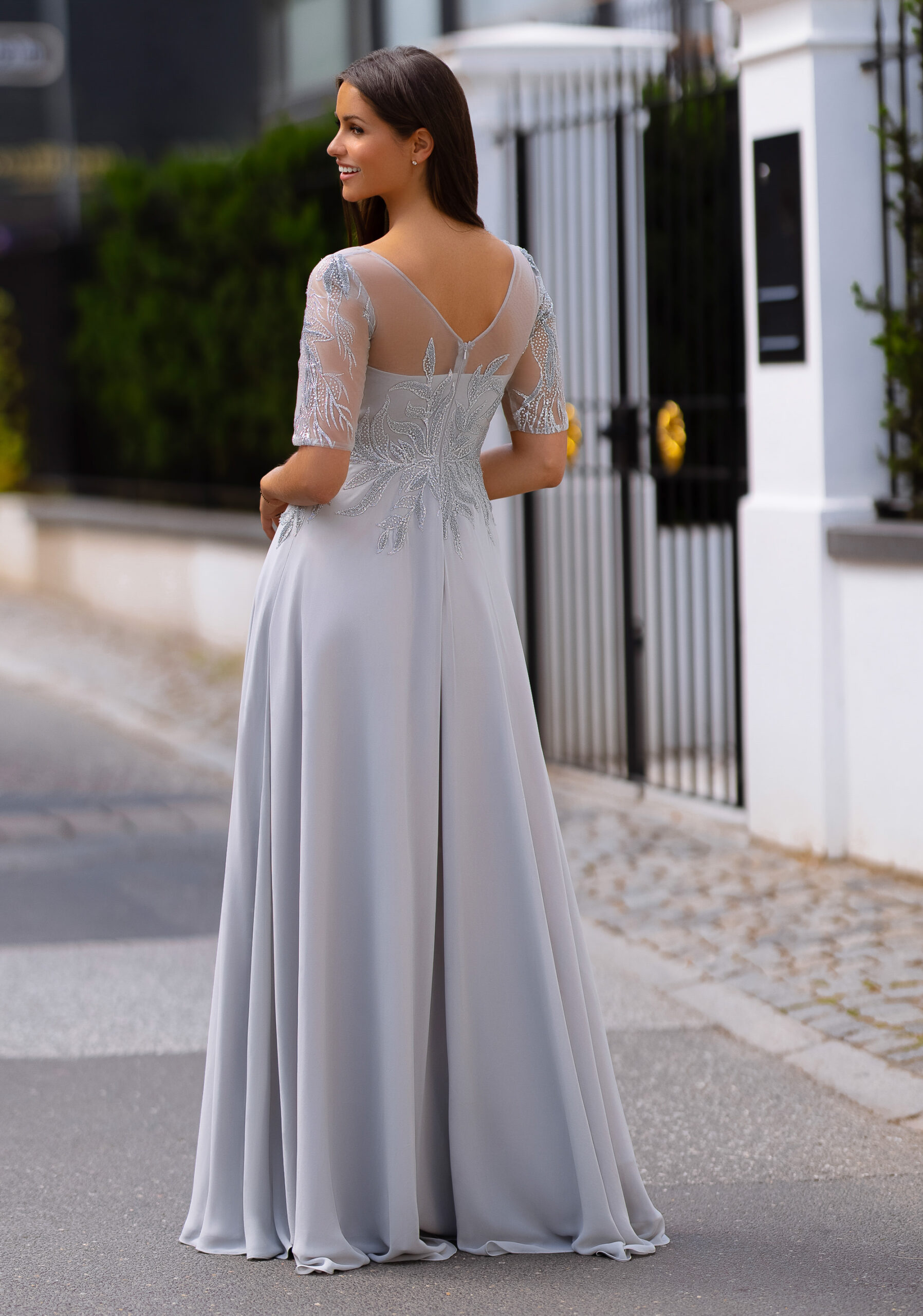 Model 0771 od značky Christian Koehlert je vyroben v elegantní stříbrnošedé barvě (silver grey) z jemného šifonu a tylu s precizně vyšívanými detaily.