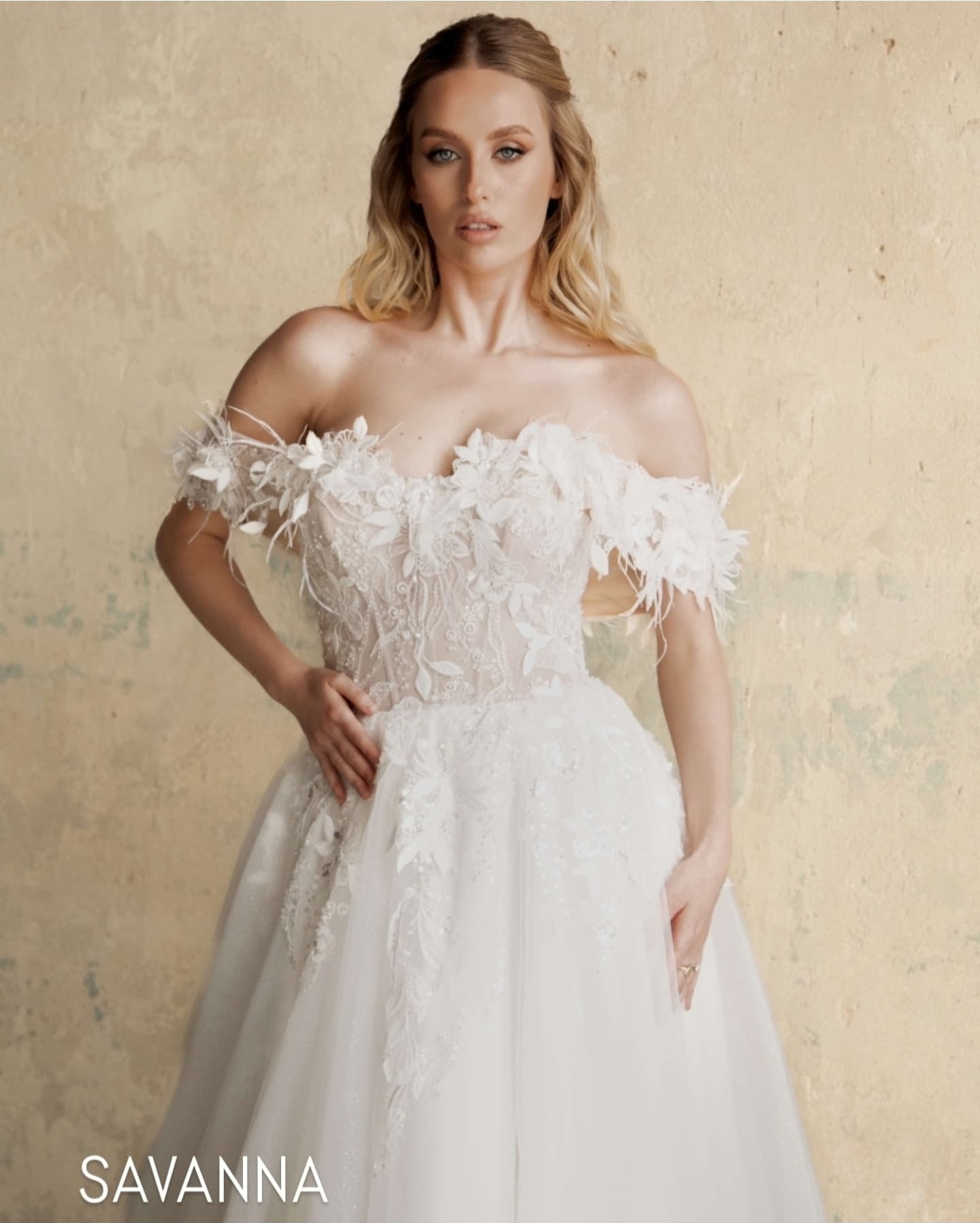 Svatební šaty v barvě ivory se spadlými ramínky, s tylovou sukní, 3D květinové aplikace a peříčka.